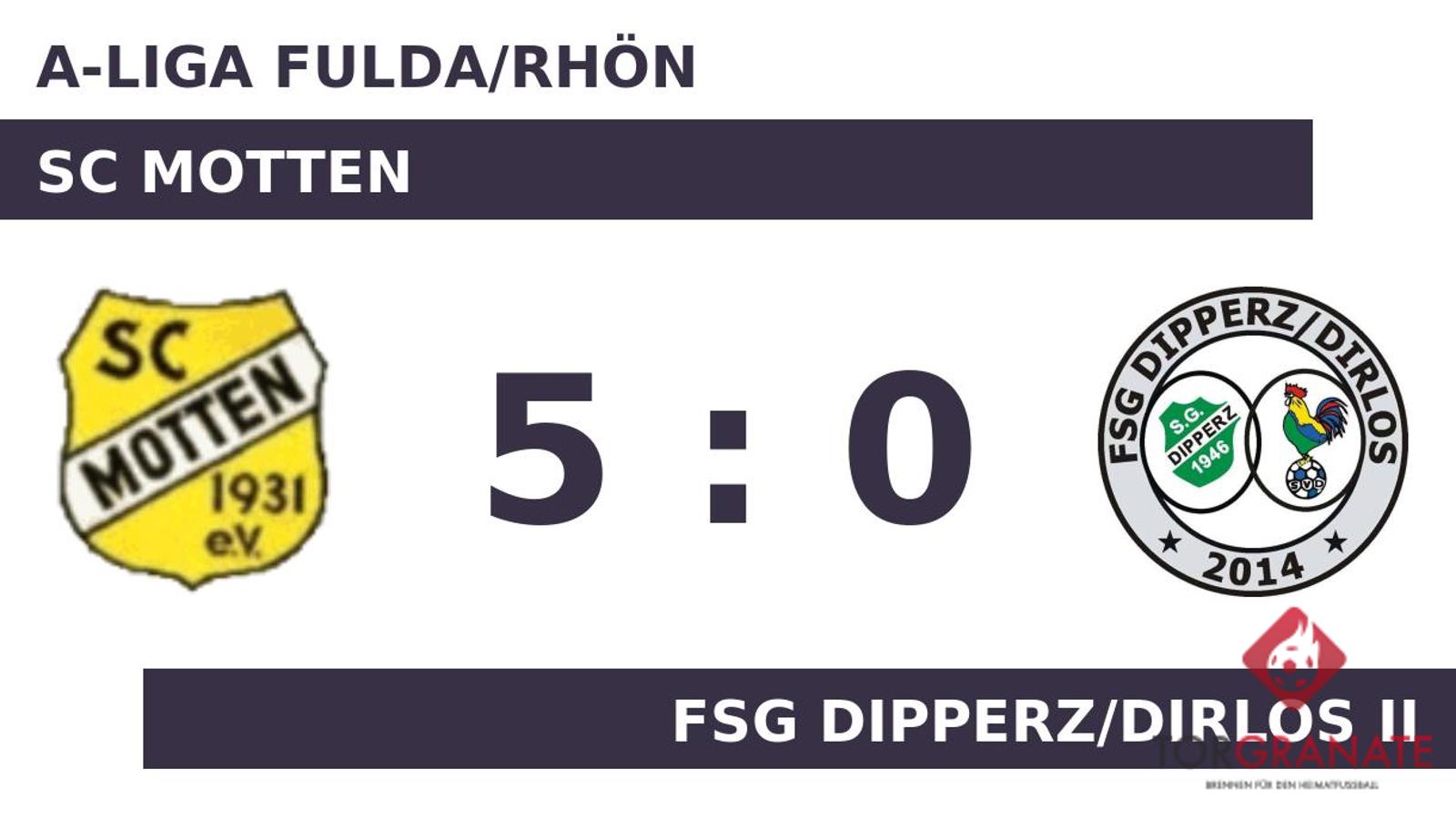 Für das 1:0 und 2:0 war Julius Mott verantwortlich. Der Akteur traf gleich zweimal ins Schwarze (16./35.). Ehe der Referee Karl-Heinz Kaupp (Bad Soden-Salmünster) die Protagonisten zur Pause bat, traf Marius Gruber zum 3:0 zugunsten des SC Motten (42.). Das überzeugende Auftreten des SCM fand Ausdruck in einer klaren Halbzeitführung. Die FSG DiDi II wechselte für den zweiten Durchgang: Nico Steinhauer spielte für Oliver Bröcker weiter. Mit dem 4:0 von Jannik Müller für den SC Motten war das Spiel eigentlich schon entschieden (47.). Ab der 52. Minute bereicherte der für Tristan Keidel eingewechselte Niklas Röhrig den SC im Vorwärtsgang. Eigentlich war die FSG Dipperz/Dirlos II schon geschlagen, als Lukas Witzel das Leder zum 0:5 über die Linie beförderte (58.). Die FSG tauschte zwei etatmäßige Verteidiger: Jakob Wachter ersetzte Maximilian Weber (62.). Mit dem Spielende fuhren die Gastgeber einen Kantersieg ein. Bereits vor dem Seitenwechsel war für DiDi klar, dass gegen den SC Motten heute kein Kraut gewachsen war.