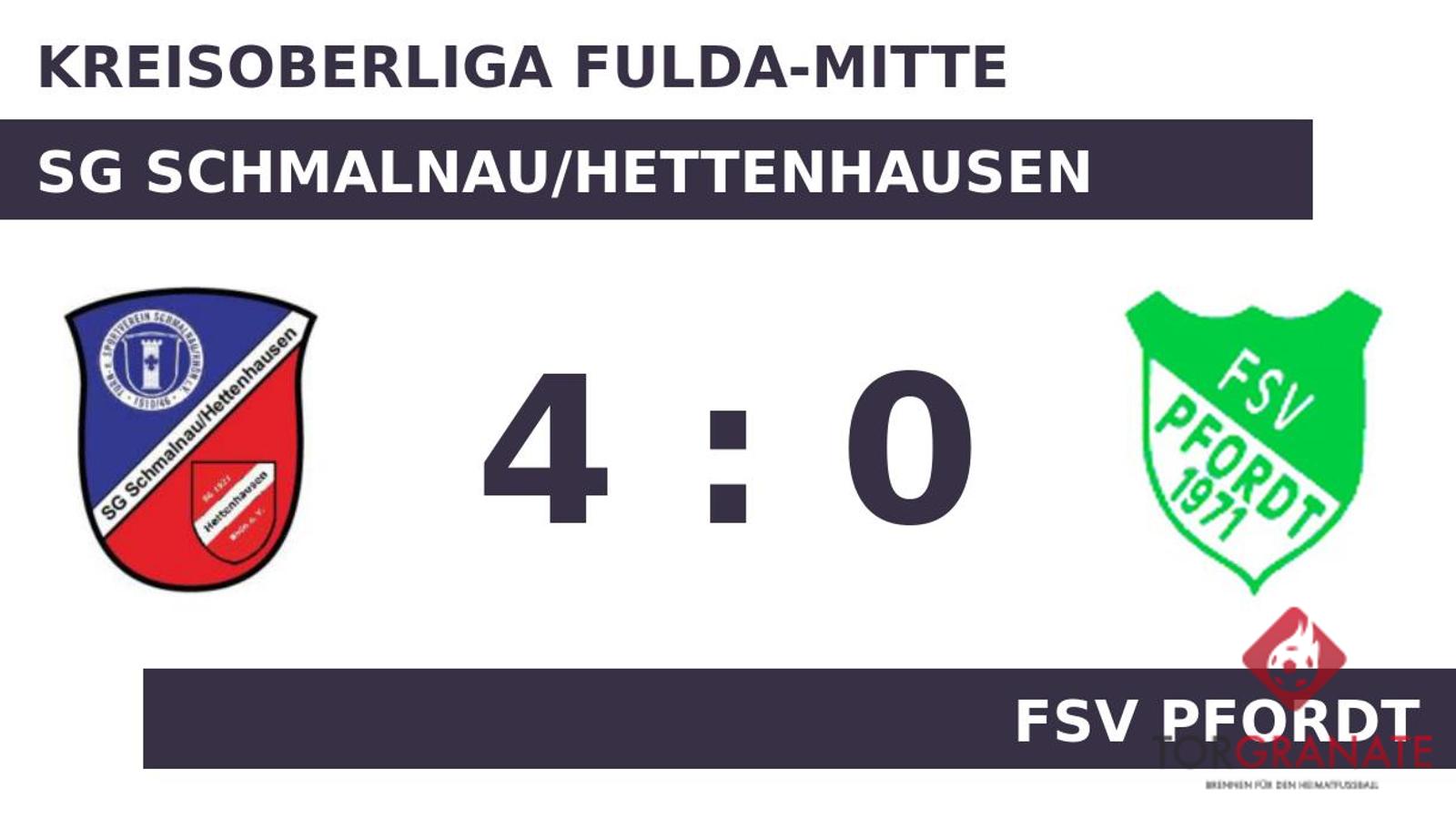Zur Halbzeit war die Partie noch vollkommen offen. Remis lautete das Zwischenresultat. Jure-Ivan Madzar brachte die SG Schmalnau/Hettenhausen in der 52. Minute nach vorn. Tobias Bub trug sich in der 55. Spielminute in die Torschützenliste ein. Der FSV Pfordt nahm in der 58. Minute einen Wechsel zweier etatmäßiger Verteidiger vor, als Florian Gärtner für Luca Feick vom Platz ging. Ab der 72. Minute bereicherte der für Jonas Bohnwagner eingewechselte Fabian Barth Schmaln./Hettenh. im Vorwärtsgang. Um die drohende Niederlage abzuwenden, kam mit Oliver Lukasch ein zusätzlicher nomineller Angreifer für den FSV Pfordt in die Partie (78). Für das 3:0 der SG Schmalnau/Hettenhausen sorgte Cornelius Schleicher, der in Minute 82 zur Stelle war. Jonas Will stellte schließlich in der 90. Minute den 4:0-Sieg für die SG sicher. Schließlich erlitt der FSV Pfordt im direkten Aufeinandertreffen mit dem Abstiegskonkurrenten eine deutliche Niederlage.