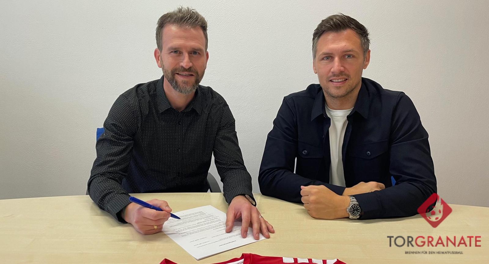 René Klingbeil (links, mit Geschäftsführer Sören Gonther) ist neuer Trainer beim Regionalligisten KSV Hessen Kassel. © KSV Hessen Kassel