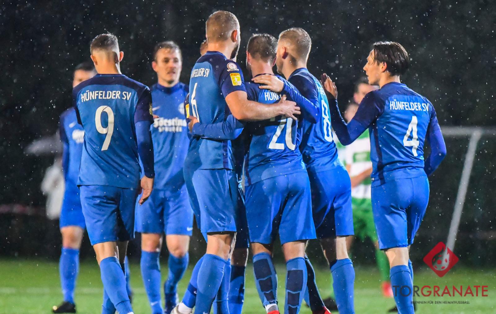 Hoffen nach dem Jubel am Mittwochabend in Bad Soden nun auf das große Los: Die Spieler des Hünfelder SV. Foto: Kevin Kremer