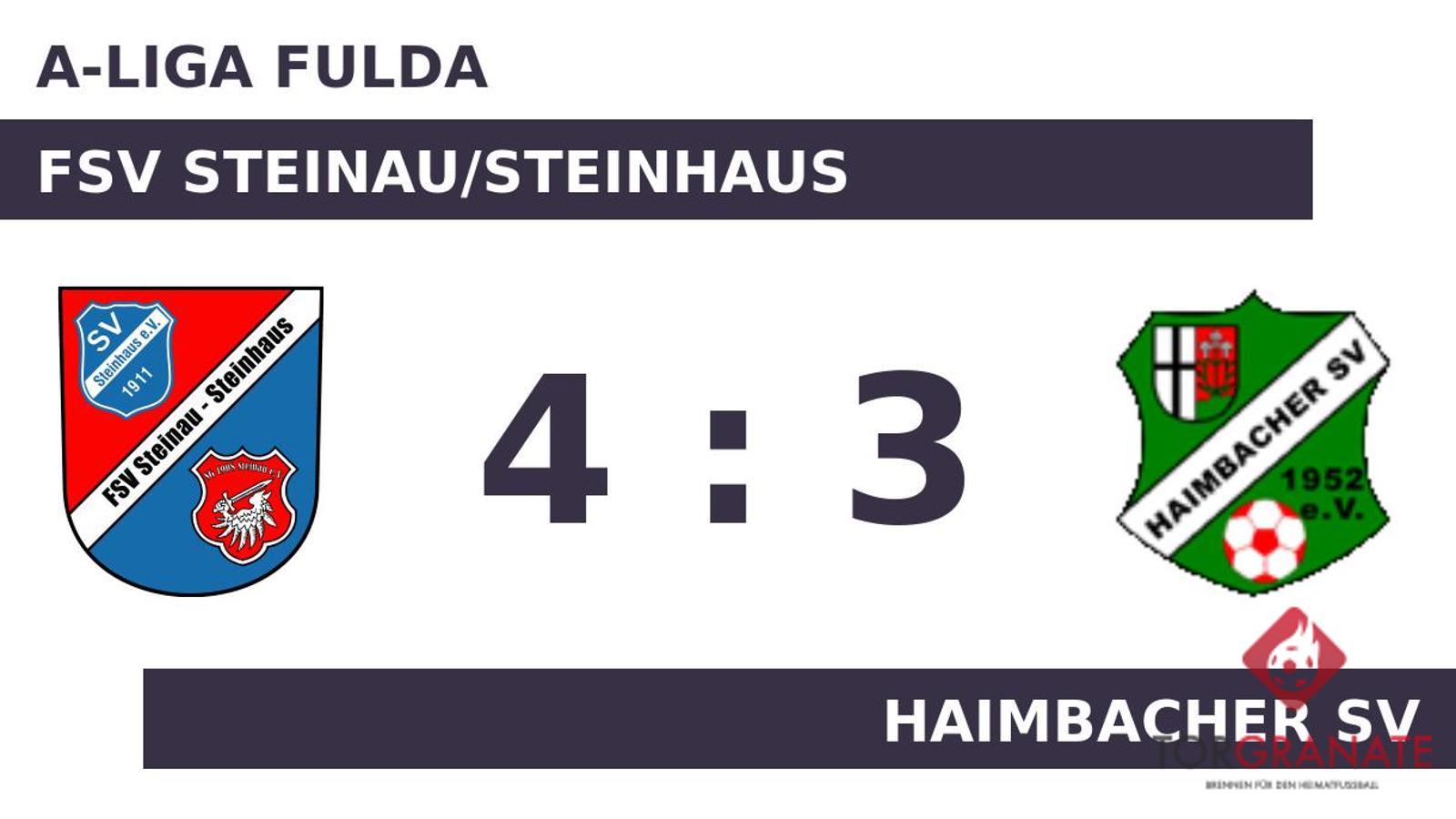 Für das erste Tor der FSV war Dominic Günther verantwortlich, der in der siebten Minute das 1:0 besorgte. Lukas Hasenauer ließ sich in der 23. Minute nicht zweimal bitten und verwertete zum 1:1 für den Haimbacher SV. Vor dem Seitenwechsel sorgte Philipp Diegelmann mit seinem Treffer für eine kalte Dusche für den HSV. Die Pausenführung von Steinau/Steinhaus fiel knapp aus. Justus Henky versenkte den Ball in der 65. Minute im Netz der Spielgemeinschaft. Fünf Minuten später ging das Heimteam durch den zweiten Treffer von Diegelmann in Führung. Noah Schultheis brachte den Ball zum 4:2 zugunsten der FSV Steinau/Steinhaus über die Linie (88.). Steinau/Steinhaus musste den Treffer von Fatih Acar zum 3:4 hinnehmen (90.). Am Ende verbuchte die FSV Steinau/Steinhaus gegen den Haimbacher SV einen Sieg.