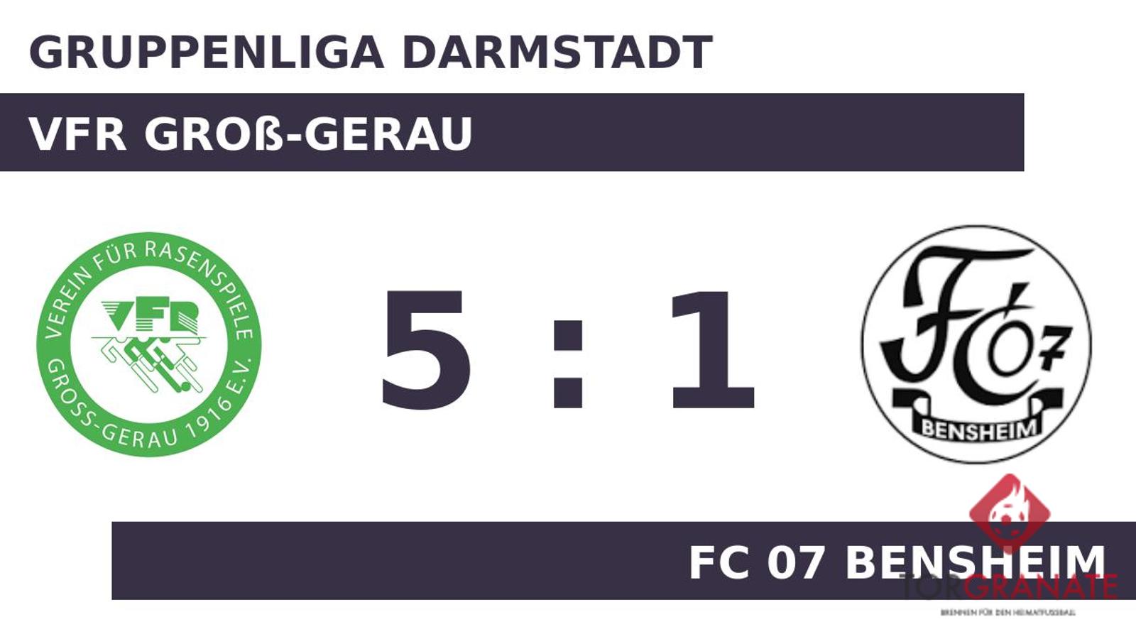 Der VFR Groß-Gerau ging durch Christoph Haddad in der 21. Minute in Führung. Doppelpack für den Gastgeber: Nach seinem ersten Tor (26.) markierte Maximilian Koehler wenig später seinen zweiten Treffer (31.). Nach dem souveränen Auftreten des Tabellenführers überraschte es kaum einen Zuschauer, dass zur Pause eine deutliche Führung stand. Der FC 07 Bensheim ging mit Formationsänderungen in die zweite Halbzeit, da Bener Kaya nun für Niclas Blüm weiterspielte. Florian Budimir beförderte das Leder zum 1:3 des Gasts über die Linie (55.). In der 68. Minute stellte der VFR Groß-Gerau personell um: Per Doppelwechsel kamen Cameron Royo und Pascal Wicht auf den Platz und ersetzten Milos Milutinovic und Kamil Kwiaton. Nick Volk baute den Vorsprung des VFR Groß-Gerau in der 86. Minute aus. Noah Lorenz stellte schließlich in der 90. Minute den 5:1-Sieg für den VFR Groß-Gerau sicher. Letztlich feierte der VFR Groß-Gerau gegen den FC 07 Bensheim nach einer überzeugenden Darbietung einen verdienten Heimsieg.