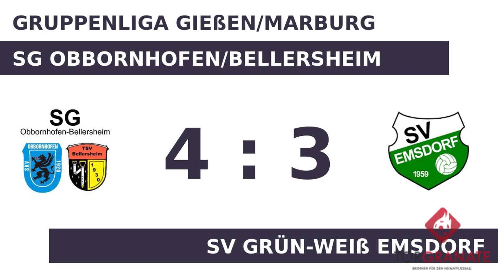 Kaum war das Spiel angepfiffen, lag der SV Emsdorf bereits in Front. Tim Schmidt markierte in der fünften Minute die Führung. Tim Richter sicherte der SG Obbornhofen/Bellersheim nach 30 Minuten den Ausgleich durch einen Elfmeter. Noch bevor es in die Halbzeit ging, war Nico Kammer mit dem 2:1 für die Gastgeber zur Stelle (45.). Das Obbornh./Bellersh. hatte zur Pause eine knappe Führung auf dem Zettel stehen. Beim SV Grün-Weiß Emsdorf kam zu Beginn der zweiten Hälfte Daniel Marczoch für Adrian Debus in die Partie. Richter schnürte mit seinem zweiten Treffer einen Doppelpack und brachte seine Mannschaft auf die Siegerstraße (57.). Es folgte der Anschlusstreffer für den SV Emsdorf – bereits der zweite für Schmidt. Nun stand es nur noch 2:3 (60.). In der 75. Minute erzielte Nico Fehrentz das 3:3 für die Gäste. In der 80. Minute brachte Tim Hufnagel den Ball im Netz des Schlusslichts unter. Letzten Endes holte die SG Obbornhofen/Bellersheim gegen den SV Grün-Weiß Emsdorf drei Zähler.