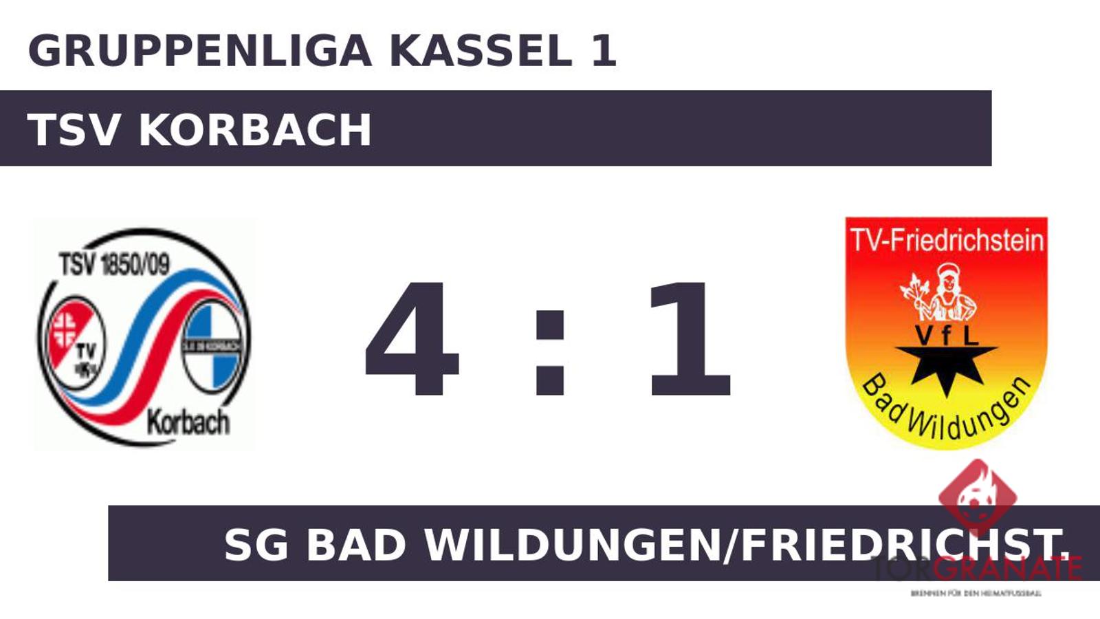 Lukas Beil brachte den TSV in der 15. Minute in Front. Wild./Friedrichst. glich bis zum Halbzeitpfiff nicht mehr aus. Schließlich schickte Referee Steffen Rabe (Münchhausen) beide Teams mit der knappen Führung für den TSV Korbach in die Kabinen. Gleich drei Wechsel nahm die SG Bad Wildungen/Friedrichst. in der 55. Minute vor. Almedin Zahovic, Joern Wagener und Mert Eliguezel verließen das Feld für Mehmet Agirgoel, Bjoern Schnedler und Pascal Camara. Jonas Hoelscher war es, der in der 79. Minute den Ball im Gehäuse des TSV Korbach unterbrachte. Dass die Korbacher in der Schlussphase auf den Sieg hofften, war das Verdienst von Fabian-Jan Jaslar, der in der 84. Minute zur Stelle war. Steffen Emde erhöhte für den Gastgeber auf 3:1 (87.). Mit dem 4:1 sicherte Beil dem TSV Korbach nicht nur den Sieg, sondern erzielte auch seinen zweiten Tagestreffer (90.). Zum Schluss feierte der TSV Korbach einen dreifachen Punktgewinn gegen Wild./Friedrichst.