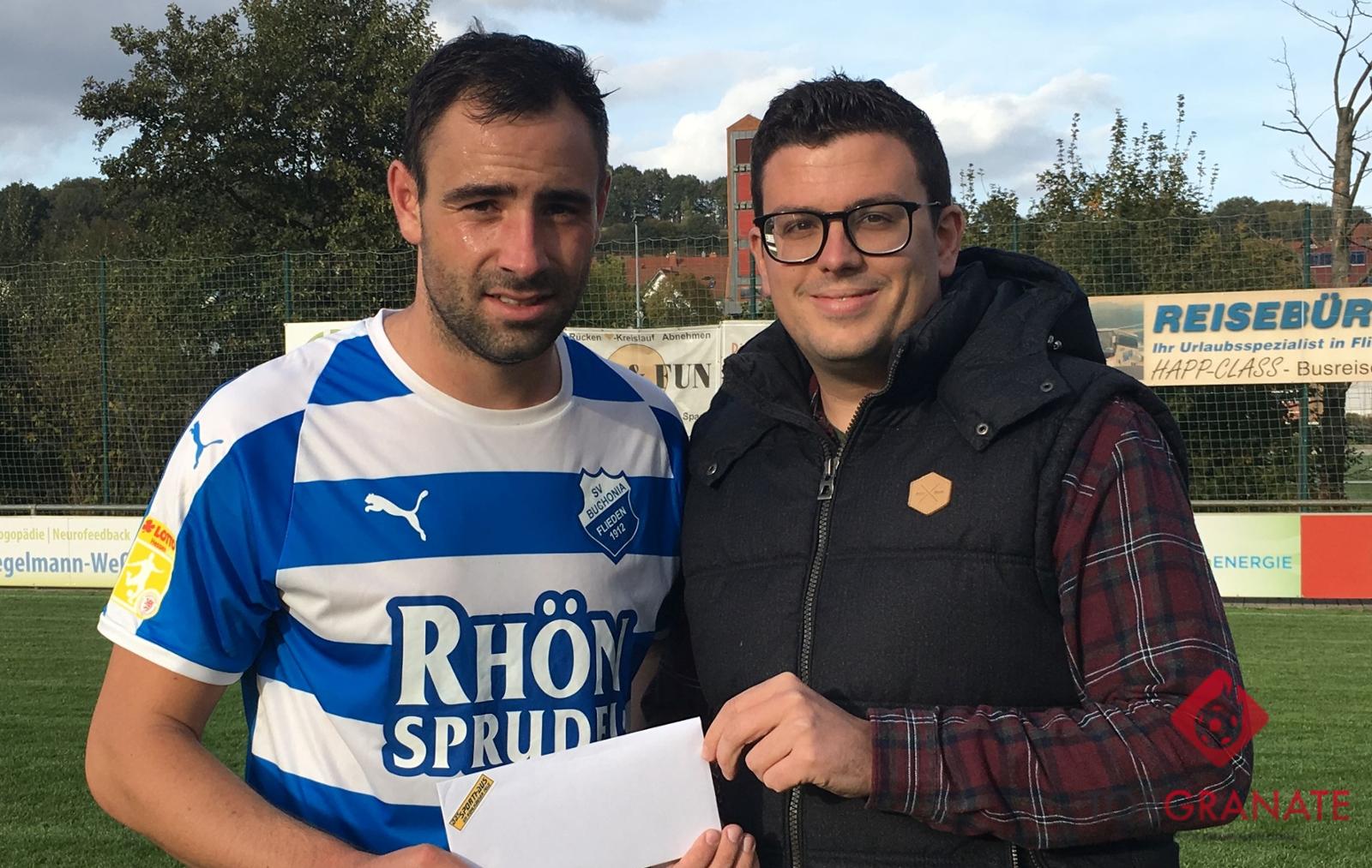 Zwar ist dem Angreifer des Hessenligisten SV Buchonia Flieden, Fabian Schaub, das Lachen nach zuletzt drei bitteren Niederlage in Folge vergangenen. Nichtsdestotrotz haben wir es uns nicht nehmen lassen, den 28-Jährigen für seine starke Leistung beim 3:4 gegen Bayern Alzenau, die ihm zum Titel der Torgranate der Woche verholfen hat, zu gratulieren. Torgranate-Redakteur Christian Halling hat Schaub bei der Übergabe des 50-Euro-Gutscheins vom Sporthaus im Kohlhäuser Feld vor der Kamera interviewt.