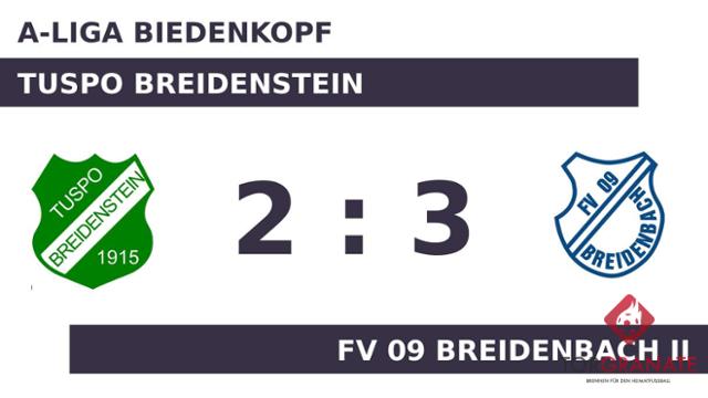 Nach nur 30 Minuten verließ Marvin Lauber vom FV Breidenbach II das Feld, Kale Ibrahim kam in die Partie. Während einige mit ihren Gedanken bereits in der Pause waren, nutzte Kaan Akmese seine Chance und schoss das 1:0 (44.) für den Gast. Einen Torerfolg in Halbzeit eins verbuchte lediglich der FV 09 Breidenbach II, womit man eine knappe Führung mit in die Kabinen nahm. Ibrahim erhöhte für den FV Breidenbach II auf 2:0 (73.). Akmese überwand den gegnerischen Schlussmann zum 3:0 für den FV 09 Breidenbach II (76.). Für das 1:3 des TuSpo Breidenstein zeichnete Moritz Henkel verantwortlich (82.). Jannik Achenbach war zur Stelle und markierte das 2:3 des Heimteams (88.). Der Tabellenletzte steigerte sich nach desolatem Beginn im Laufe der Partie. Unterm Strich erwies sich der Rückstand jedoch als zu groß, als dass der TuSpo Breidenstein etwas hätte mitnehmen können.