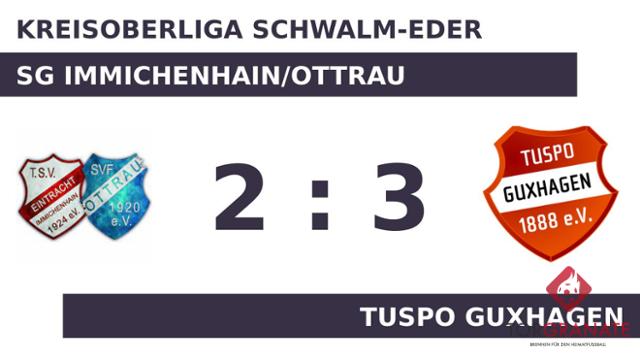 Jonas Korell musste nach nur 16 Minuten vom Platz, für ihn spielte Andreas Schwalm weiter. Lukas Gerhold brachte die TuSpo Guxhagen in der 28. Minute in Front. Frederik Schmidt erhöhte für die TuSpo Guxhagen auf 2:0 (33.). Mit dem 3:0 durch Jens Menne schien die Partie bereits in der 38. Minute mit der TuSpo Guxhagen einen sicheren Sieger zu haben. Wenige Momente vor dem Seitenwechsel war Marco Hermann mit dem 1:3 für Immichenhain/Ottrau zur Stelle (45.). Es waren die Gäste, die zur Pause eine Führung ihr Eigen nannten. Für das zweite Tor der SG Immichenhain/Ottrau war Timon Falk verantwortlich, der in der 71. Minute das 2:3 besorgte. Ein Debakel, nach dem es zunächst ausgesehen hatte, konnte der Tabellenletzte noch verhindern. Doch zu etwas Zählbarem kam der Gastgeber am Ende nicht mehr.