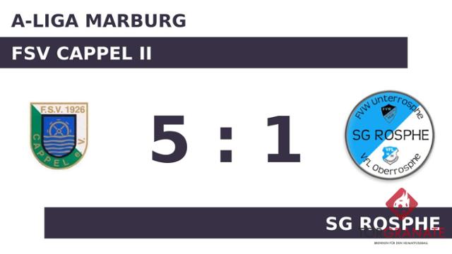Die SG Rosphe geriet schon in der neunten Minute in Rückstand, als Max Heuser das schnelle 1:0 für den FSV Cappel II erzielte. Fitim Braha ließ sich in der 32. Minute nicht zweimal bitten und verwertete zum 2:0 für den FSV Cappel II. Ohne weitere Tore ging es in die Pause. Zum Seitenwechsel ersetzte Johannes Linne von der SG Rosphe seinen Teamkameraden Alexander Koch. Tim Florian Zinneker überwand den gegnerischen Schlussmann zum 3:0 für den FSV Cappel II (53.). Hendrik Lein war es, der in der 66. Minute den Ball im Gehäuse des FSV Cappel II unterbrachte. Den Vorsprung des FSV Cappel II ließ Torben Blendermann in der 69. Minute anwachsen. Heuser stellte wenige Minuten vor dem Schlusspfiff den Stand von 5:1 für den FSV Cappel II her (87.). Schließlich erlitt die SG Rosphe im direkten Aufeinandertreffen mit dem Abstiegskonkurrenten eine deutliche Niederlage.