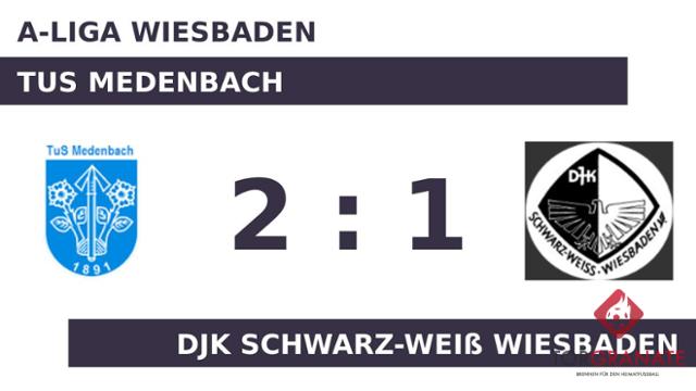 Ehe es in die Kabinen ging, markierte Manuel Ulm das 1:0 für den TuS Medenbach (41.). Der TuS Medenbach führte zur Halbzeit knapp mit einem Tor Vorsprung. Filip Marinovic war es, der in der 73. Minute den Ball im Gehäuse des TuS Medenbach unterbrachte. Der TuS Medenbach gelangte durch ein Selbsttor der DJK Schwarz-Weiß Wiesbaden zur 2:1-Führung (90.). Am Ende verbuchte der TuS Medenbach gegen die DJK SW Wiesbaden die maximale Punkteausbeute.