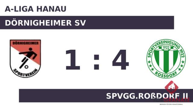 Nach nur 28 Minuten verließ Najibulah Massud vom Dörnigheimer SV das Feld, Heinrich Schweizer kam in die Partie. Nach den ersten 45 Minuten ging es für das Heimteam und Spvgg.Roßdorf II ohne Torerfolg in die Kabinen. In der Pause stellte der Dörnigheimer SV personell um: Per Doppelwechsel kamen Bektas Dogan und Tolga Cimen auf den Platz und ersetzten Murat Alparslan und Ahmad Wasil Afzali. Für den Führungstreffer von Spvgg.Roßdorf II zeichnete Etienne Kroener verantwortlich (48.). Marius Graefe erhöhte für Spvgg.Roßdorf II auf 2:0 (55.). In der 58. Minute erzielte Emir Draganovic das 1:2 für den Dörnigheimer SV. Arsen Manukjan versenkte die Kugel zum 3:1 für Spvgg.Roßdorf II (70.). Imad Lagmouch besorgte in der Schlussphase schließlich den vierten Treffer für Spvgg.Roßdorf II (77.). Mit dem Ende der Spielzeit strich Spvgg.Roßdorf II gegen den Dörnigheimer SV die volle Ausbeute ein.