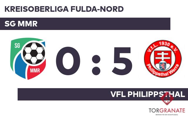 Zu Beginn der Begegnung neutralisierten sich beide Mannschaften so weit, dass sich keine von ihnen eine Torchance herausspielte. Niklas Weber brachte den VfL Philippsthal in der 17. Minute nach vorn. Die Pausenführung des VfL fiel knapp aus. In der 46. Minute brachte Tim Ruch den Ball im Netz der SG MMR unter. Weber gelang ein Doppelpack (49./52.), mit dem er das Ergebnis auf 4:0 hochschraubte. Leon May besorgte in der Schlussphase schließlich den fünften Treffer für den VfL Philippsthal (76.). Die Philippsthaler überrannten die SG MMR förmlich mit fünf Toren und fahren so mit einem verdienten Sieg in der Tasche nach Hause.