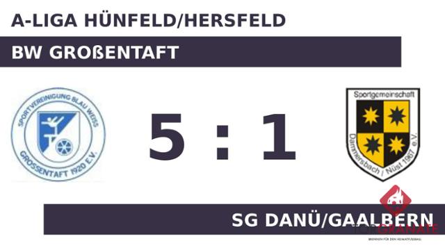Patrick Lesser schoss in der 13. Minute vom Elfmeterpunkt das erste Tor des Spiels für die Sportvereinigung. Cino Schwab machte in der 17. Minute das 2:0 der Großentafter perfekt. Das letzte Tor der turbulenten Startphase markierte Ilyas Karouaoui in der 20. Minute. Nach nur 23 Minuten verließ Ilyas Karouaoui von der SG DaNü/Gaalbern das Feld, Nelson Wiegand kam in die Partie. Mit der knappen Führung von BW Großentaft pfiff der Schiedsrichter zur Halbzeit. Parwes Adel witterte seine Chance und schoss den Ball zum 3:1 für BW ein (70.). Wenig später kamen Valentin Matkovic und Louis Bischof per Doppelwechsel für Schwab und Adel auf Seiten des Gastgebers ins Match (76.). Für das 4:1 des Tabellenprimus sorgte Maximilian Michel, der in Minute 80 zur Stelle war. Julien Mackenrodt stellte schließlich in der 90. Minute den 5:1-Sieg für BW Großentaft sicher. Am Ende kam BW Großentaft gegen die SG DaNü/Gaalbern zu einem verdienten Sieg.