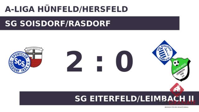 Nils Schuhmann stellte die Weichen für die SG Soisdorf/Rasdorf auf Sieg, als er in Minute elf mit dem 1:0 zur Stelle war. Zur Pause reklamierte der SCS eine knappe Führung für sich. In der Pause wechselte die SG Eiterfeld/Leimbach II den nominellen Stürmer Ali Dogru für Luca Pfalzgraf ein. Die SG Soisdorf/Rasdorf wechselte für den zweiten Durchgang: Dominik Will spielte für Brian Ziegler weiter. Für das 2:0 des SC zeichnete Louis Schmitt verantwortlich (53.). In den 90 Minuten waren die Soisdorfer im gegnerischen Strafraum erfolgreicher als Eiterf./Leimbach II und fuhren somit einen 2:0-Sieg ein.