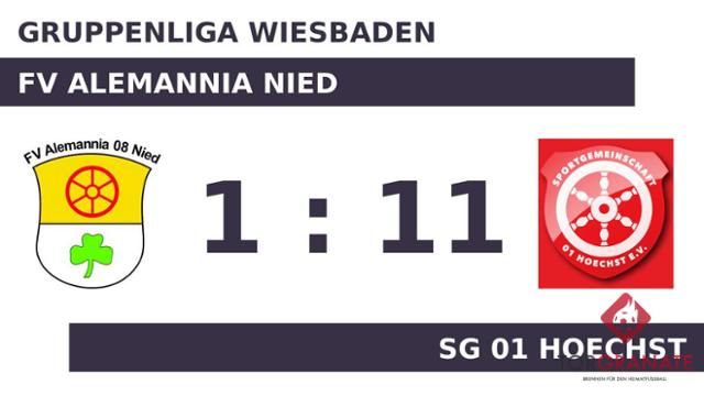 Die Gastgeber gerieten schon in der neunten Minute in Rückstand, als Turgay Akbulut das schnelle 1:0 für die SG 01 Hoechst erzielte. Firat Tayboga versenkte die Kugel zum 2:0 für die SG 01 Hoechst (22.). Mit dem 3:0 durch Justin Matthews schien die Partie bereits in der 28. Minute mit den Gästen einen sicheren Sieger zu haben. Sascha Müller beförderte das Leder zum 1:3 des FV Alemannia Nied über die Linie (30.). Die SG 01 Hoechst spielte weiter nach vorne und so traf Akbulut (34./41.) und Nikola Colovejic (37.) ins gegnerische Tor. Mit einer deutlichen Führung der SG 01 Hoechst ging es in die Halbzeitpause. Barkan Aksu gelang ein Doppelpack (61./69.), mit dem er das Ergebnis auf 8:1 hochschraubte. Nach den Treffern von Bilal Hamdaoui (75.) und Akbulut (80.) setzte Matthews (88.) den Schlusspunkt für die SG 01 Hoechst. Am Ende ließ die SG 01 Hoechst kein gutes Haar am FV Alemannia Nied und siegte außerordentlich hoch.