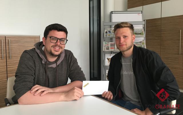 David Vogt (rechts) erhält seinen Gutschein vom Sporthaus Kohlhäuser Feld von Torgranate-Redakteur Christian Halling.